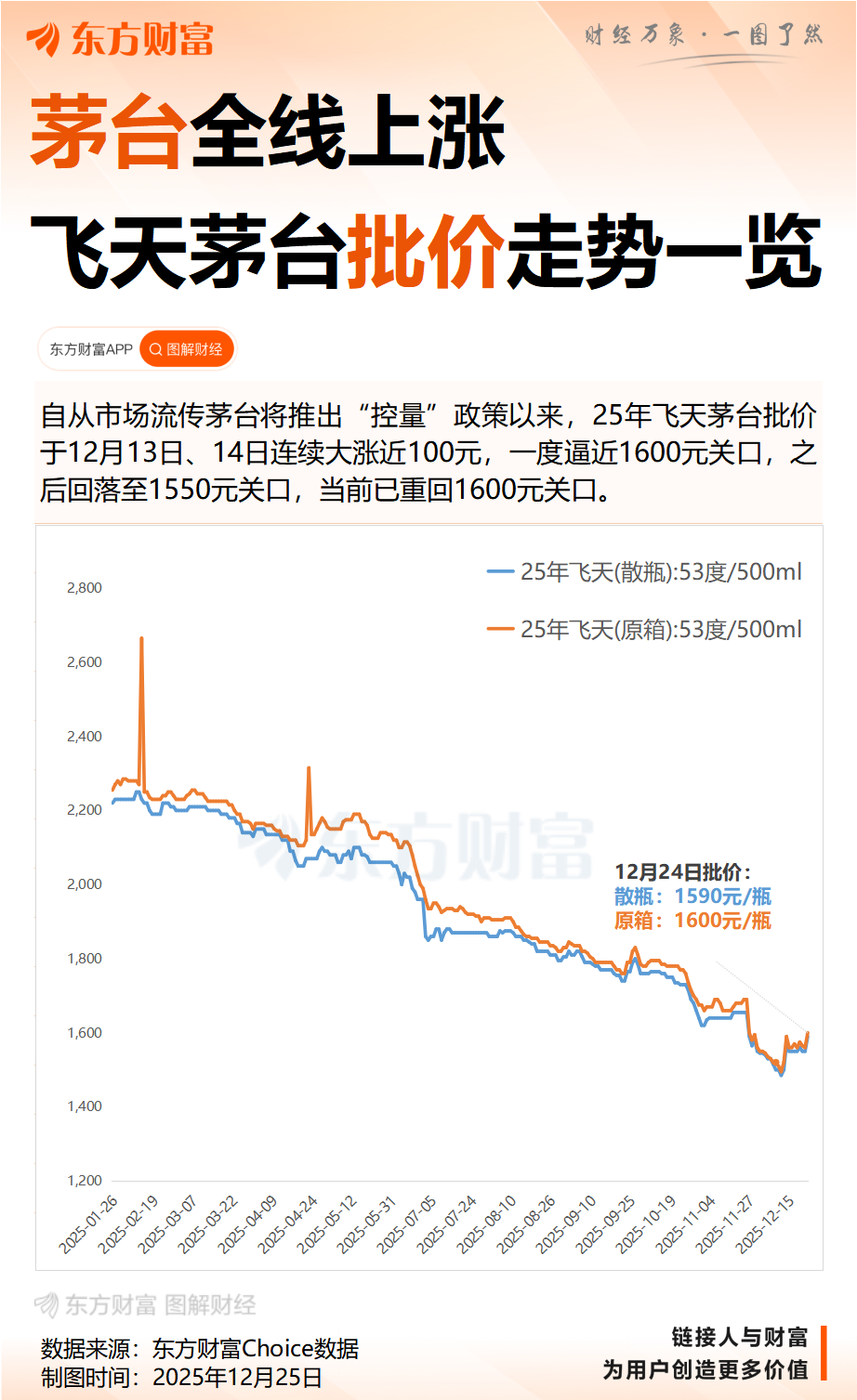记者留意到,自从市场流传茅台将推出“控量”政策以来,25年飞天茅台批价于12月13日、14日连续大涨近100元,一度逼近1600元关口,之后回落至1550元关口,当前已重回1600元关口。
